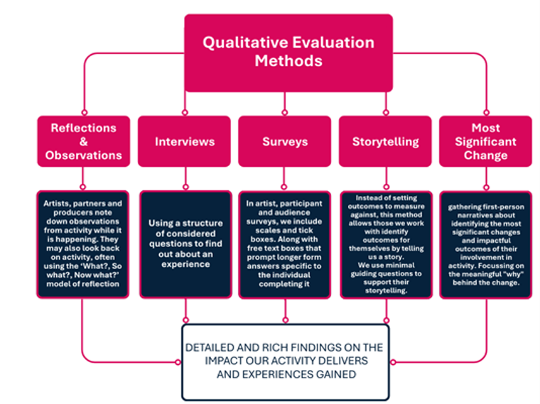 Above: A flowchart of the qualitative evaluation methods we utilise across Orchestras Live programmes and projects.